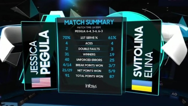 Тенісистки провели на корті 1 годину і 55 хвилин. У вирішальному сеті Пегула лідирувала з брейком 4-1, Світоліній вдалося скоротити відставання до 3-4, але потім українка втратила ще один гейм на своїй подачі. Реалізувавши свій четвертий прихований матчбол, американка потім зуміла захистити подачу й оформила путівку до чвертьфіналу.
