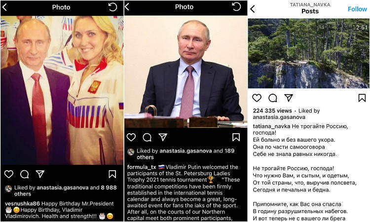 Для BTU тези, озвучені Гасановою, не стали великою несподіванкою. Раніше в Instagram ми знаходили “вподобайки” від тенісистки, наприклад, під привітанням до дня народження путіна в 2017 році від іншої російської тенісистки Олени Весніної, далі під публікацією турніру в Санкт-Петербурзі за березень 2021 року, в якій є фото російського президента і його слова привітання учасницям змагань. Ми також знайшли “вподобайку” від тенісистки під публікацією Тетяни Навки, олімпійської чемпіонки з фігурного катання й дружини прессекратаря путіна Дмитра Пєскова, з віршем болгарського поета Дончо Нанов Дончева “Не трогайте Россию, господа”.