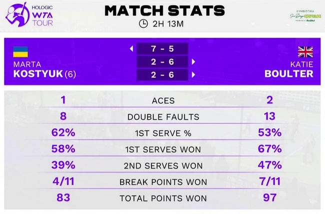 У двох наступних сетах Марта Костюк п’ять разів програла свою подачу і змогла лише один раз взяти гейм на подачі Бултер.