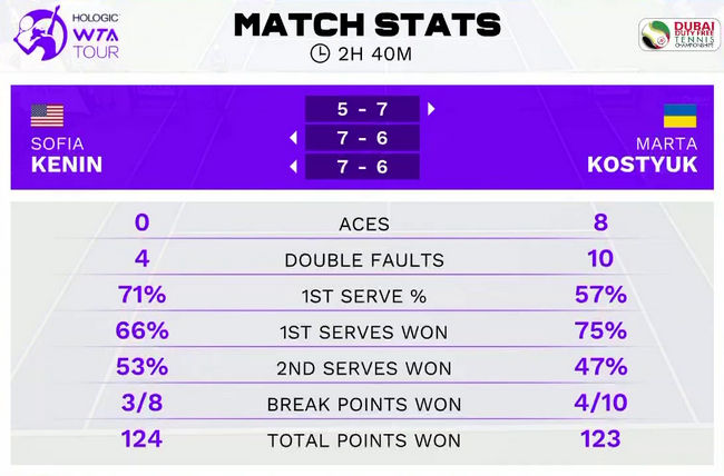 Українська тенісистка не змогла перемогти Кенін у їхньому першому протистоянні. Зазначимо, що протягом першого сету матч зупинявся через дощ, а після нього пауза склала трохи більше п’яти годин. У другому сеті Костюк не змогла реалізувати два матчболи на тай-брейку.