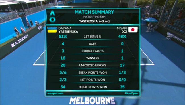 Даяна Ястремська (Україна) – Місакі Дої (Японія, 17) 6:3, 6:1