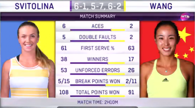 У вирішальному сеті Світоліна одразу ж вийшла вперед з брейком, взяла ще один гейм суперниці і зуміла завершити зустріч на свою користь за дві години і десять хвилин.