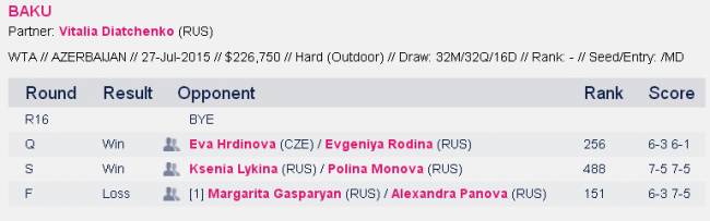 Украинка проводит свой третий парный финал в сезоне. Ранее Савчук сыграла в решающих матчах в Куала-Лумпуре вместе с Юлией Бейгельзимер, а также в финале Бостада с немкой Татьяной Марией. В Баку дуэт Ольги Савчук и Виталии Дьяченко уступил лидерам посева Маргарите Гаспарян и Александре Пановой.