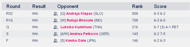 «Моя победа в полуфинале над Петкович придала мне уверенности в собственных силах, потому что еще недавно Андреа входила в топ-десятку мирового рейтинга. Чтобы обыграть ее мне нужно было показать по-настоящему хороший теннис, — признавалась Элина. — В финале я понимала, какую тактику выберет моя соперница, поэтому и сама знала, что должна играть каждый мяч, каждый розыгрыш, будто он последний. Важно было на протяжении матча не терять концентрацию. Думаю, все прошло неплохо».
